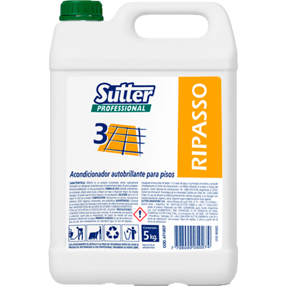 RIPASSO es un producto concentrado, neutro, especialmente formulado con detergentes protectores para el mantenimiento diario de pisos protegidos. Fórmula antideslizante, no crea acumulaciones.